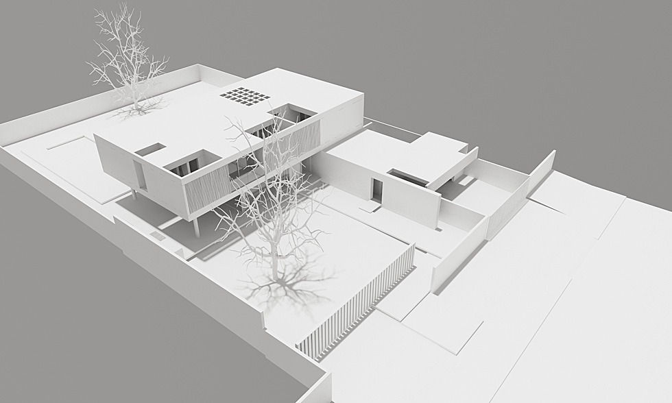 Es por ello que el programa se distribuye en dos barras; una paralela al medianero oriente que contiene los dormitorios y sala de estar que refuerza el eje de relación entre ambos árboles y una barra perpendicular en segundo nivel que contiene el dormitorio principal y alberga el living-comedor en primer nivel en una situación prácticamente de exterior que percibe el largo total del terreno en medio del dialogo de los árboles.